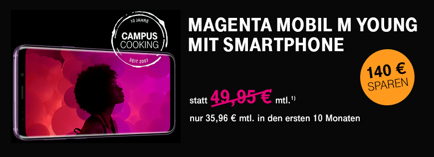 Aktuelles Angebot für alle unter 27 Jahren. Ab sofort sparen: 10 Euro in den ersten 10 Monaten plus Online-VorteilR-936_m, bei Vermittlung von MagentaMobil M Young mit oder ohne (Top-)Smartphone im Aktionszeitraum vom 16.05. bis 20.07.2018 13 Uhr.